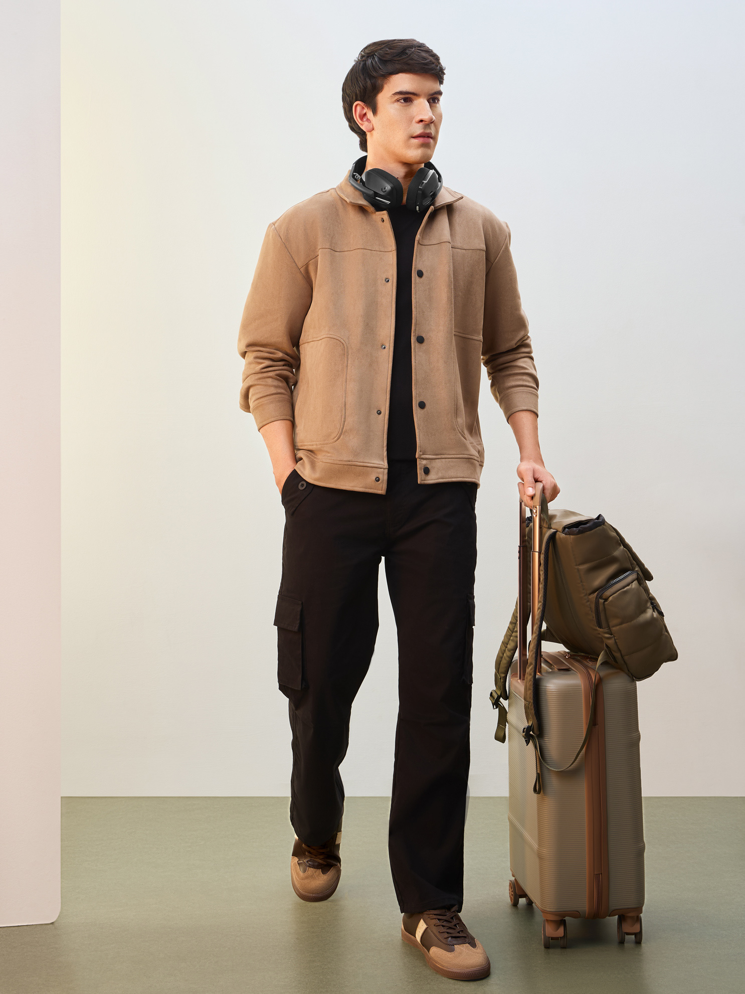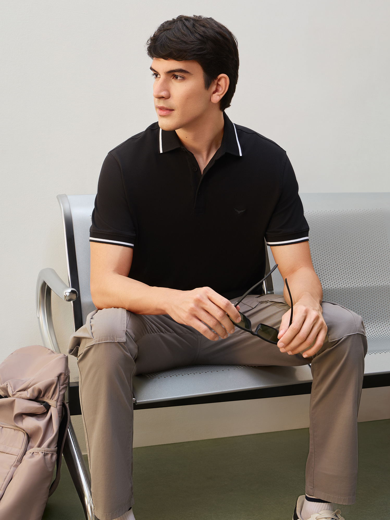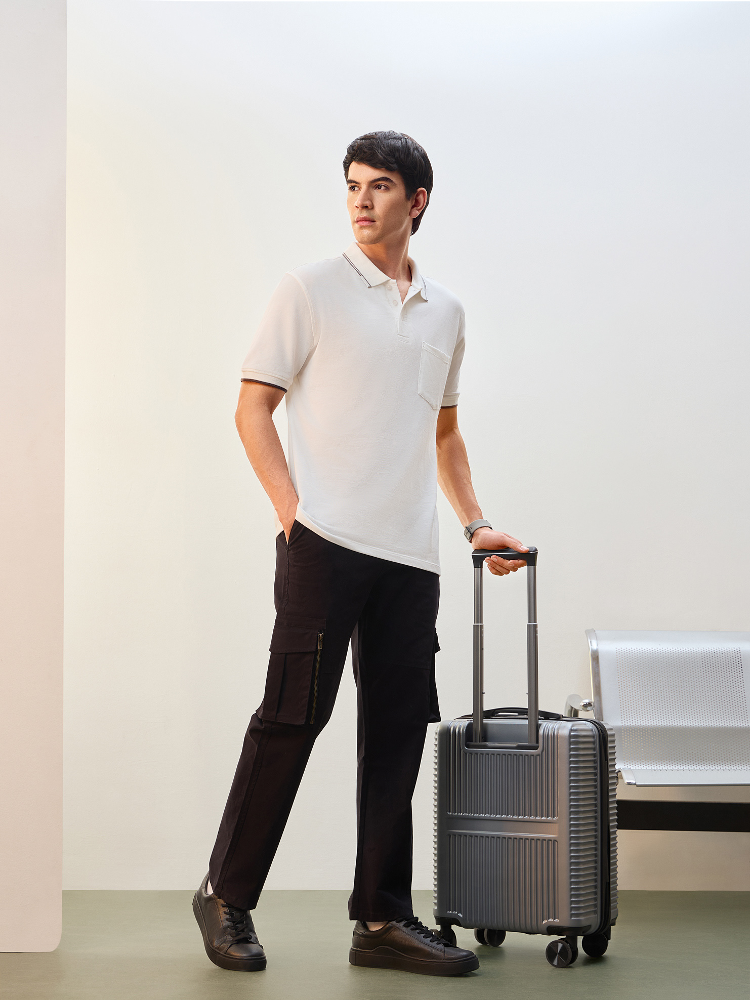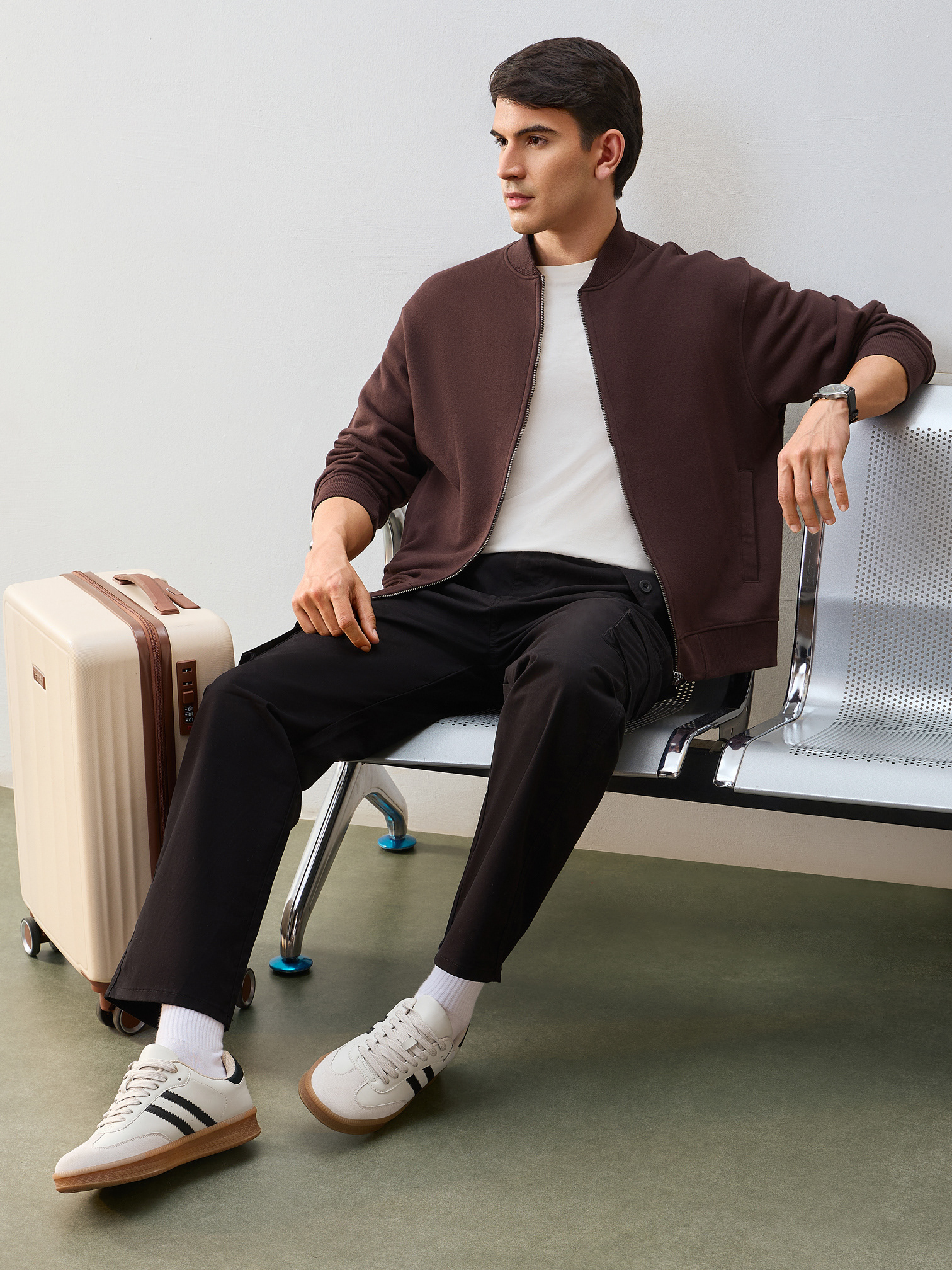 Nobero Men’s Travel Collection: A professional fashion campaign shoot replicating a luxury airport lounge. High-quality e-commerce imagery focusing on the "airport look" trend and functional travel apparel.