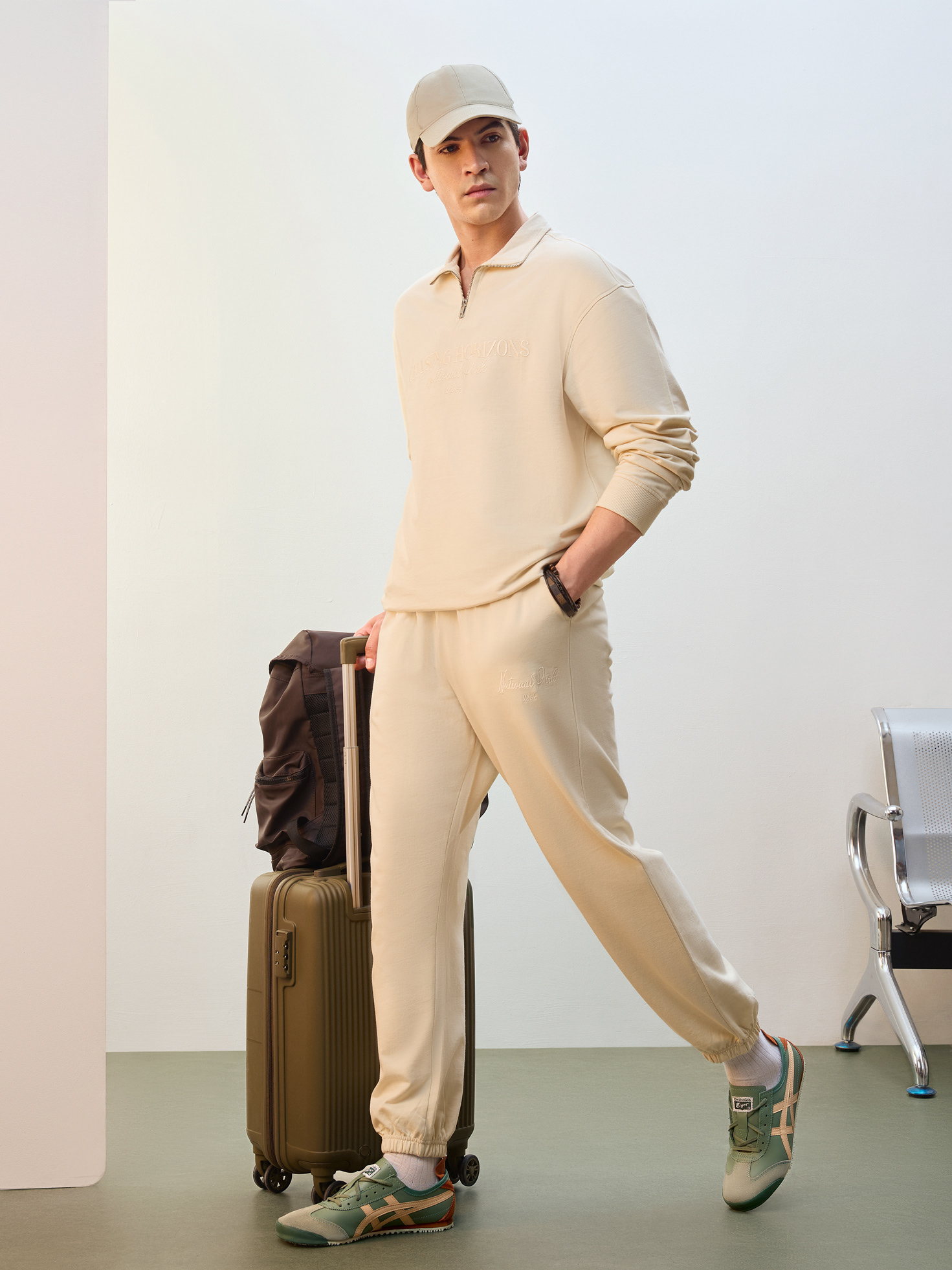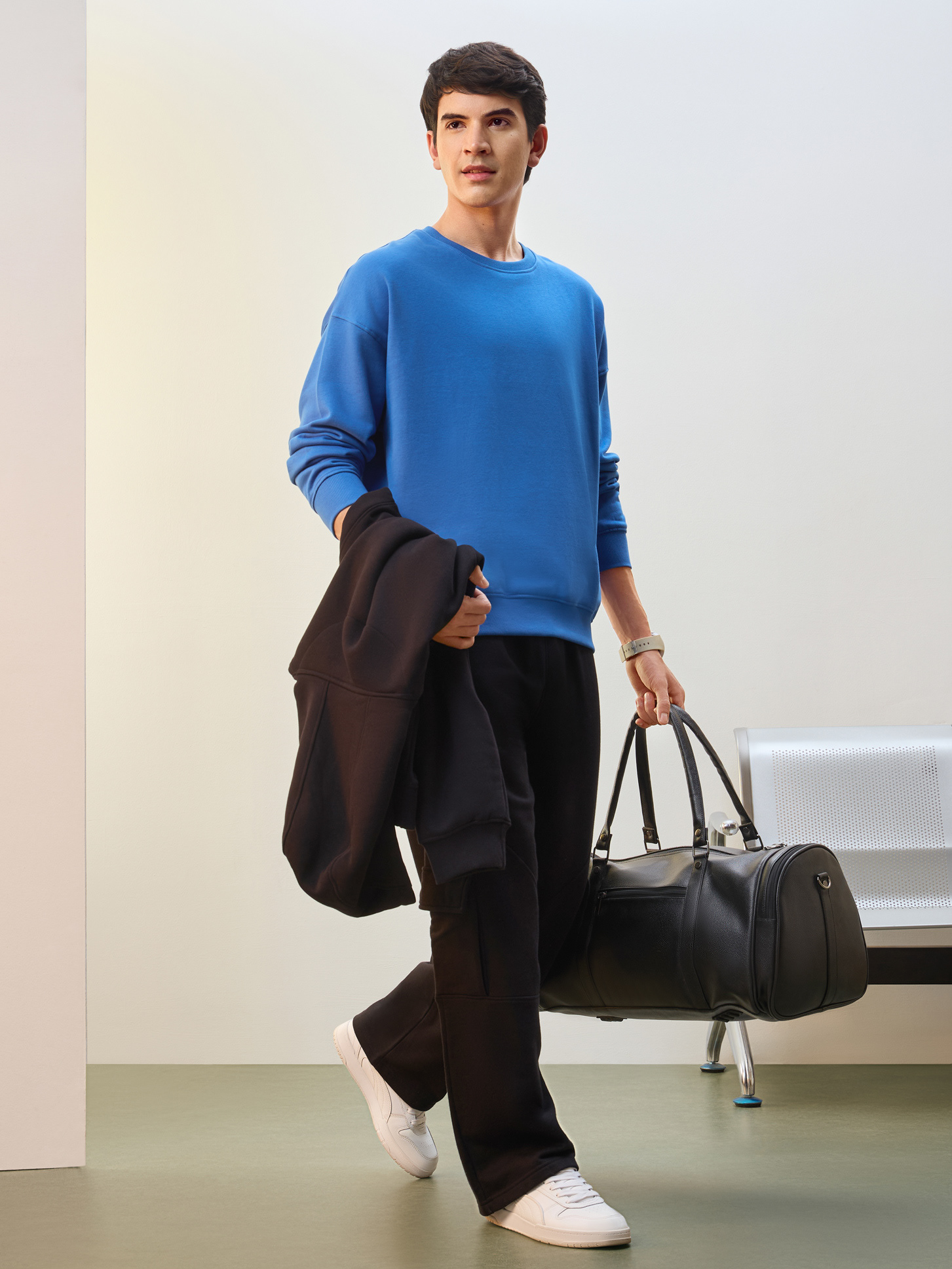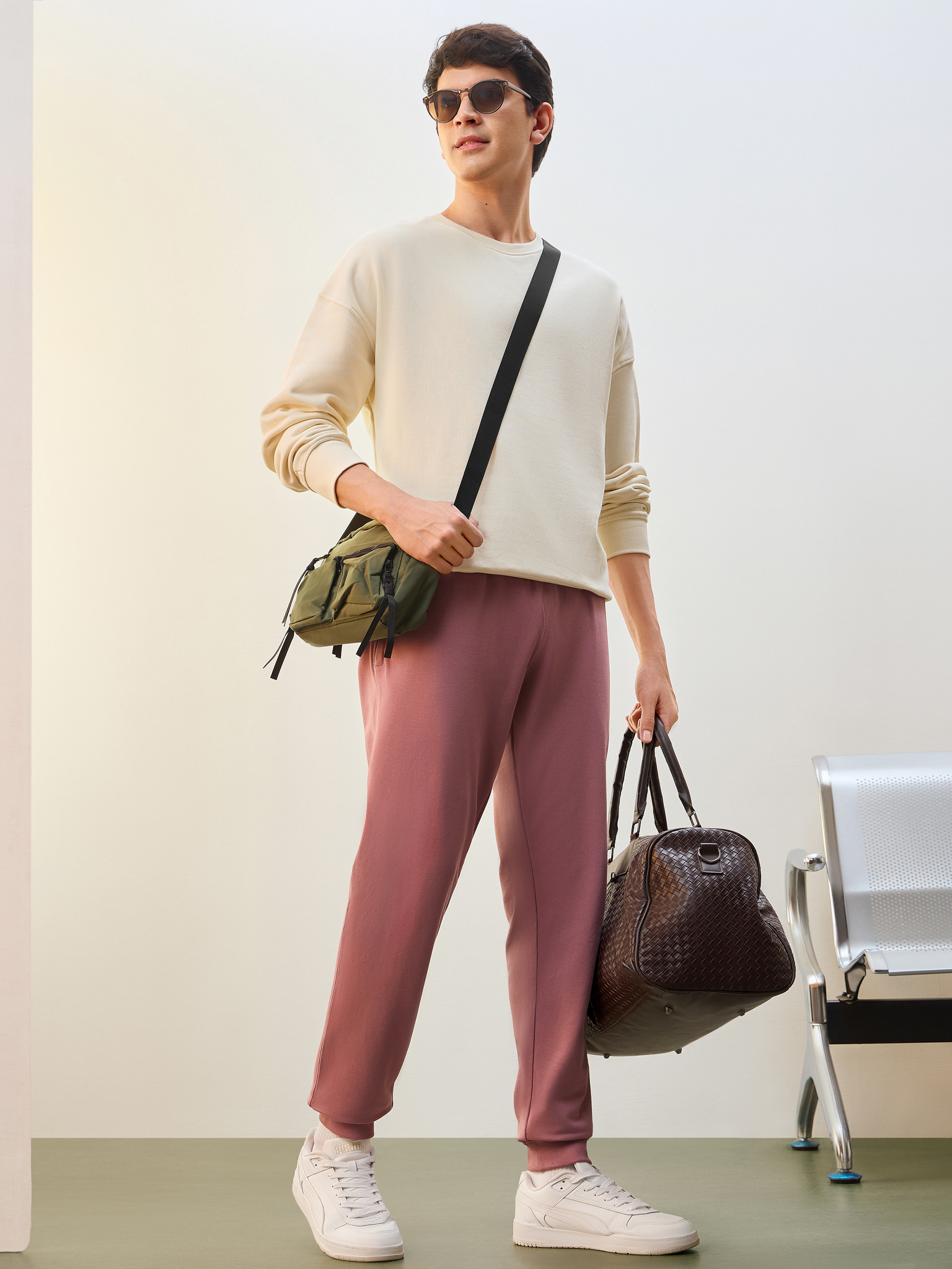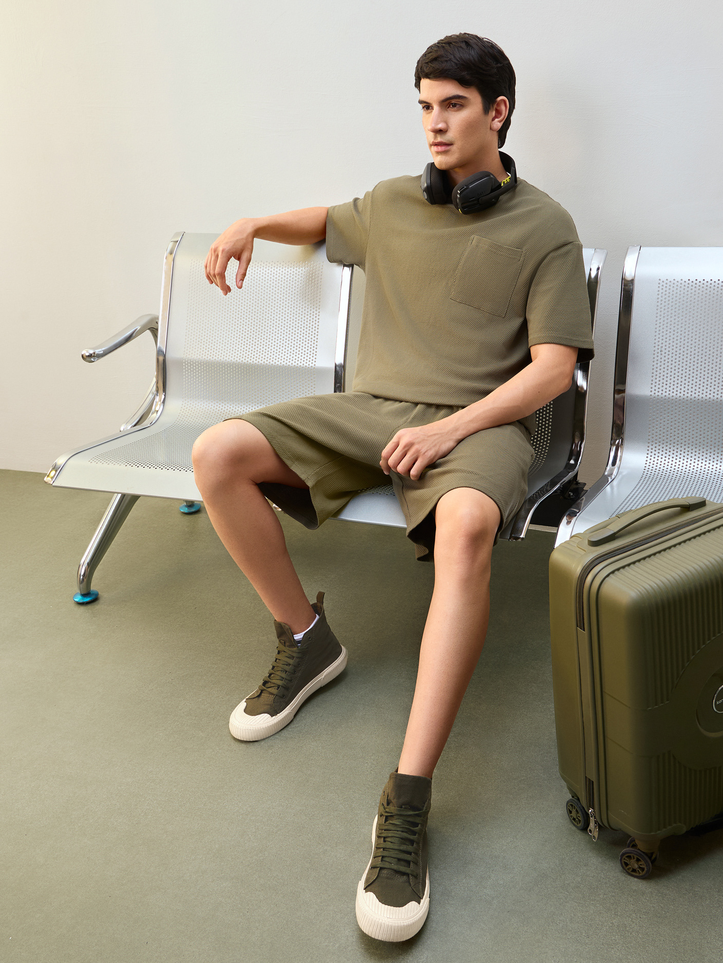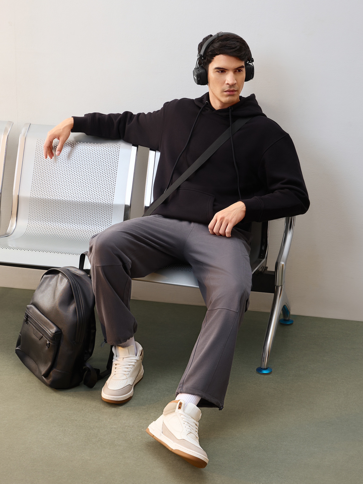 Nobero Men’s Travel Collection: A professional fashion campaign shoot replicating a luxury airport lounge. High-quality e-commerce imagery focusing on the "airport look" trend and functional travel apparel.