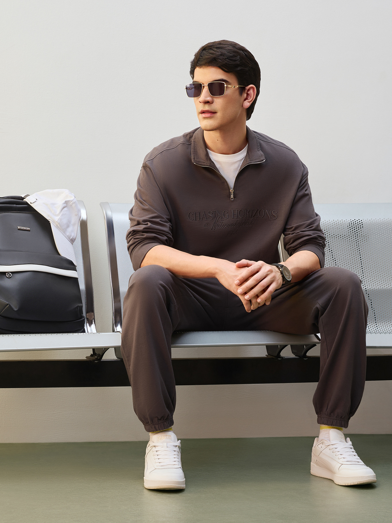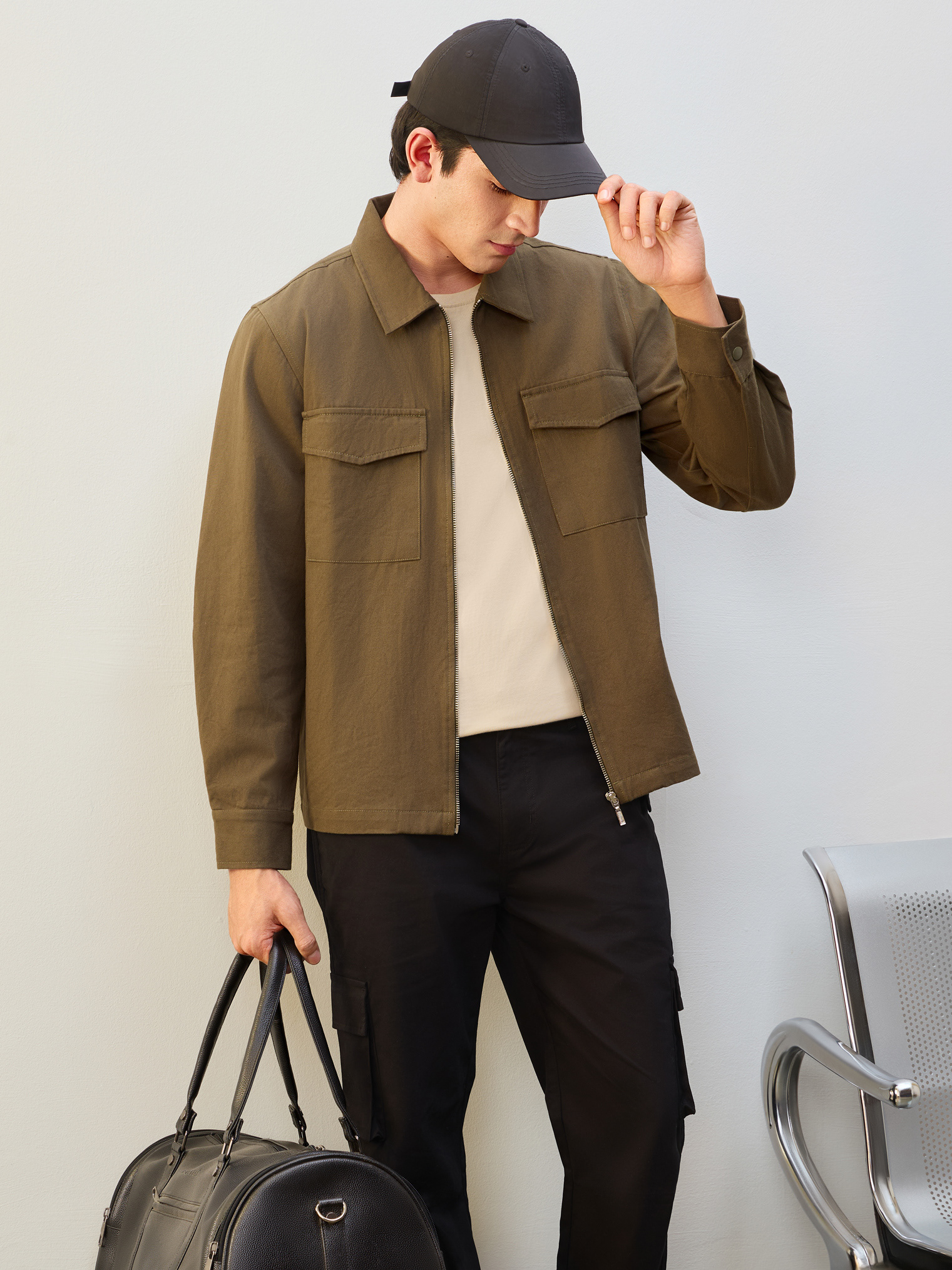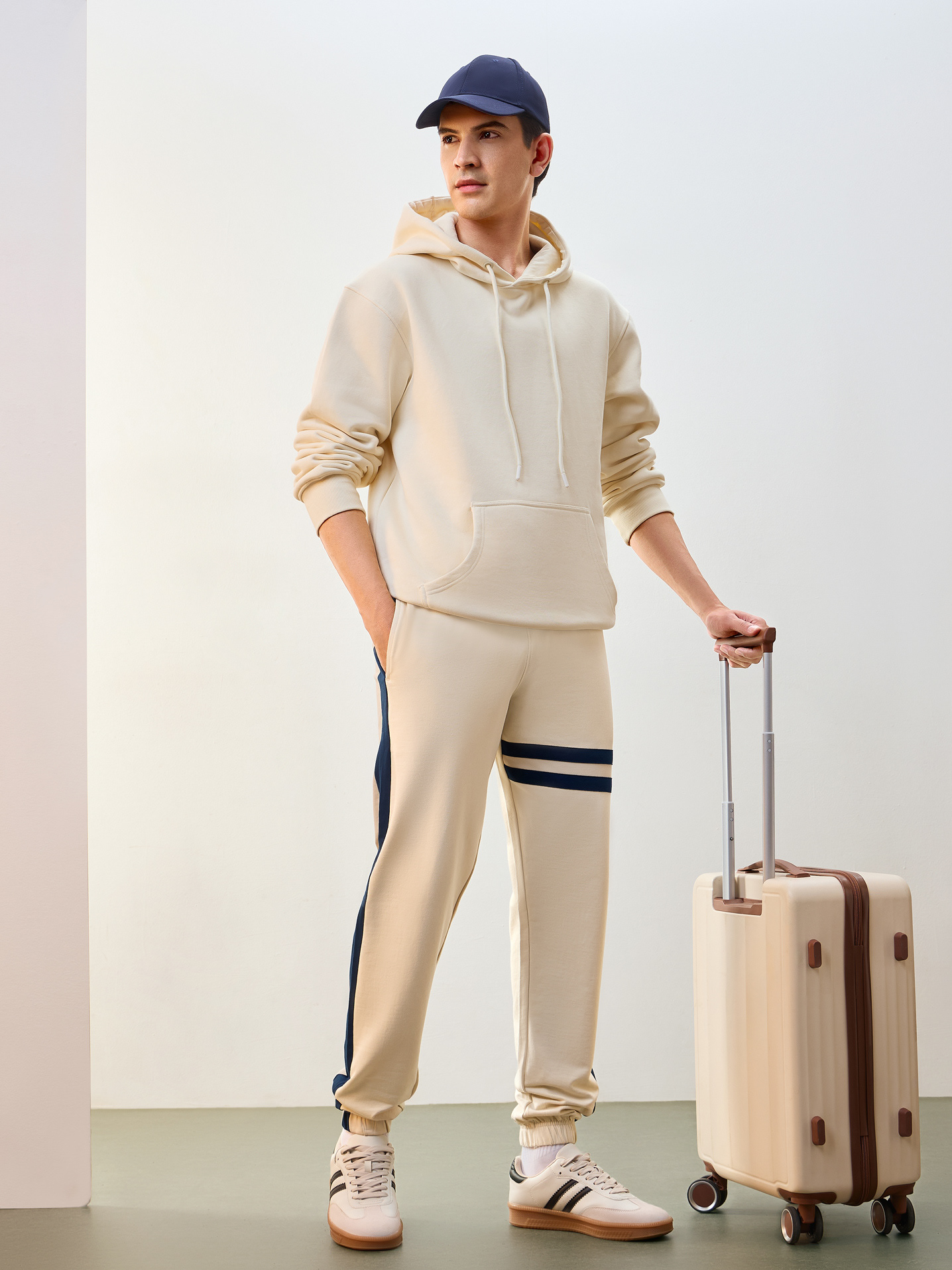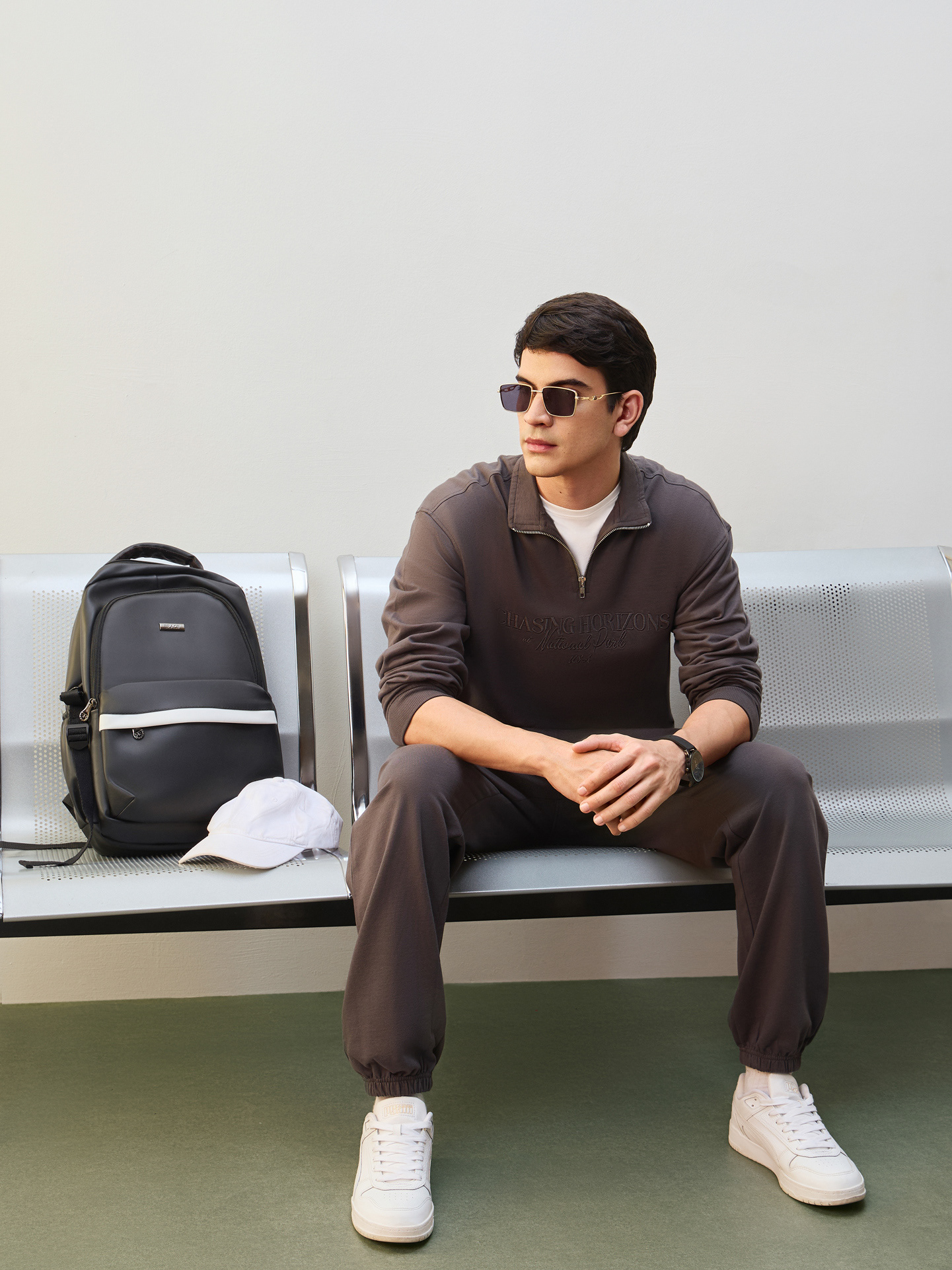 Nobero Men’s Travel Collection: A professional fashion campaign shoot replicating a luxury airport lounge. High-quality e-commerce imagery focusing on the "airport look" trend and functional travel apparel.