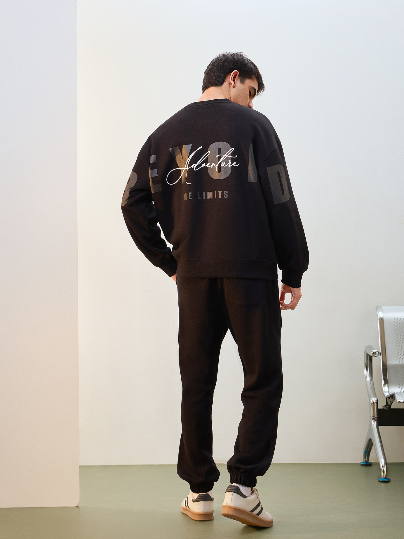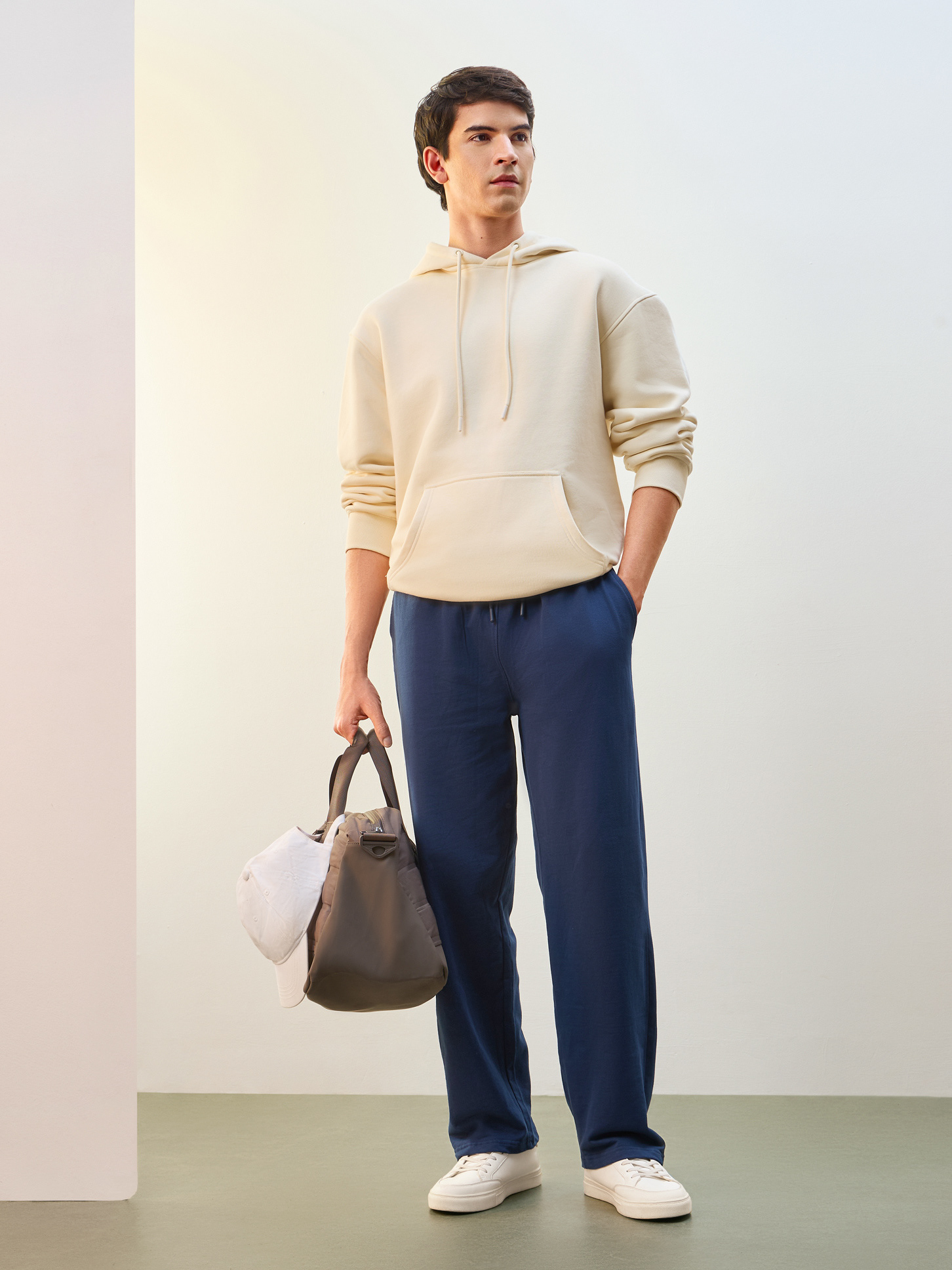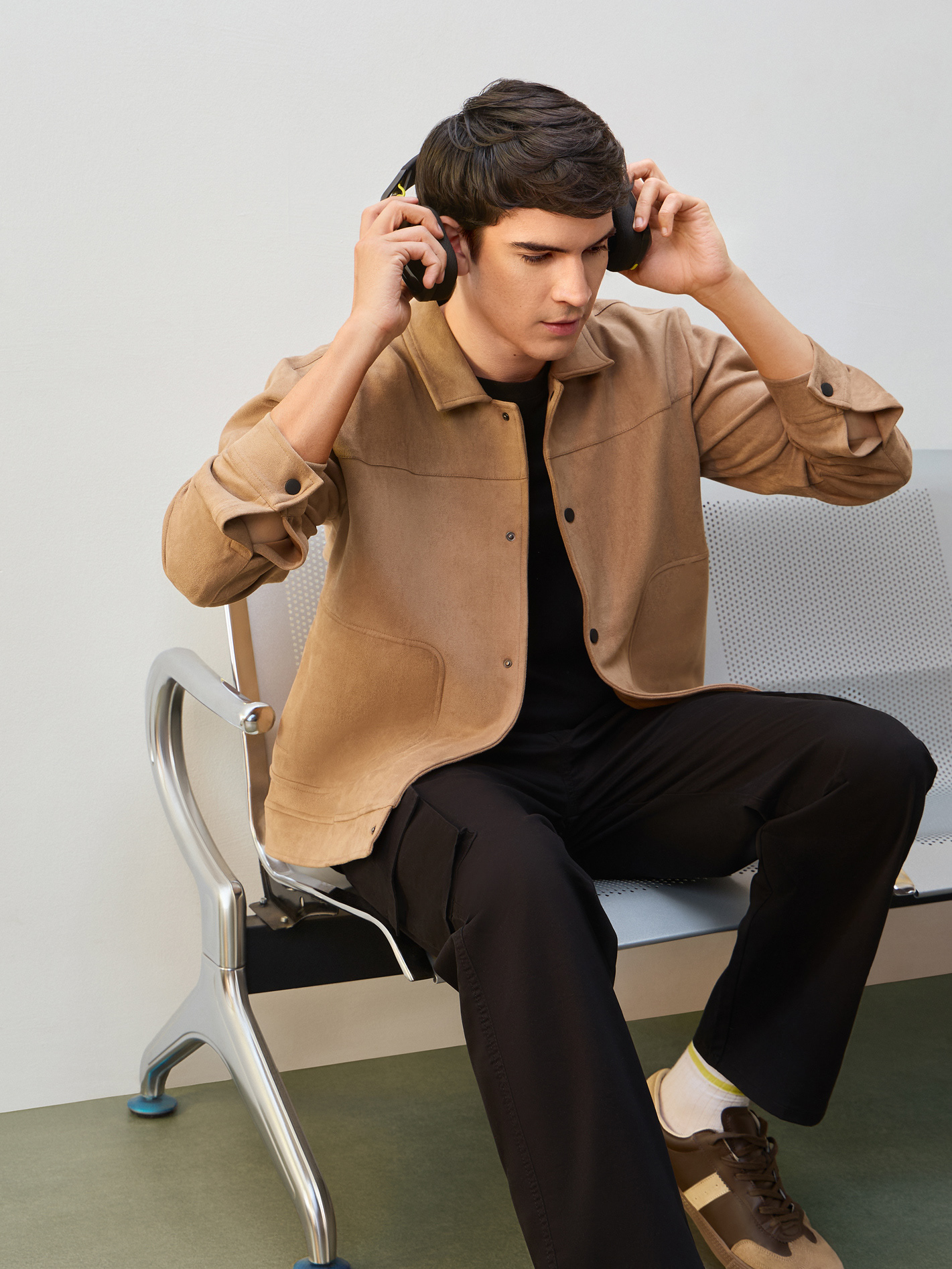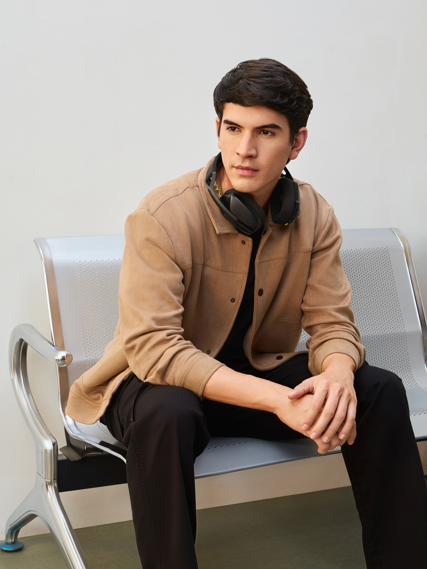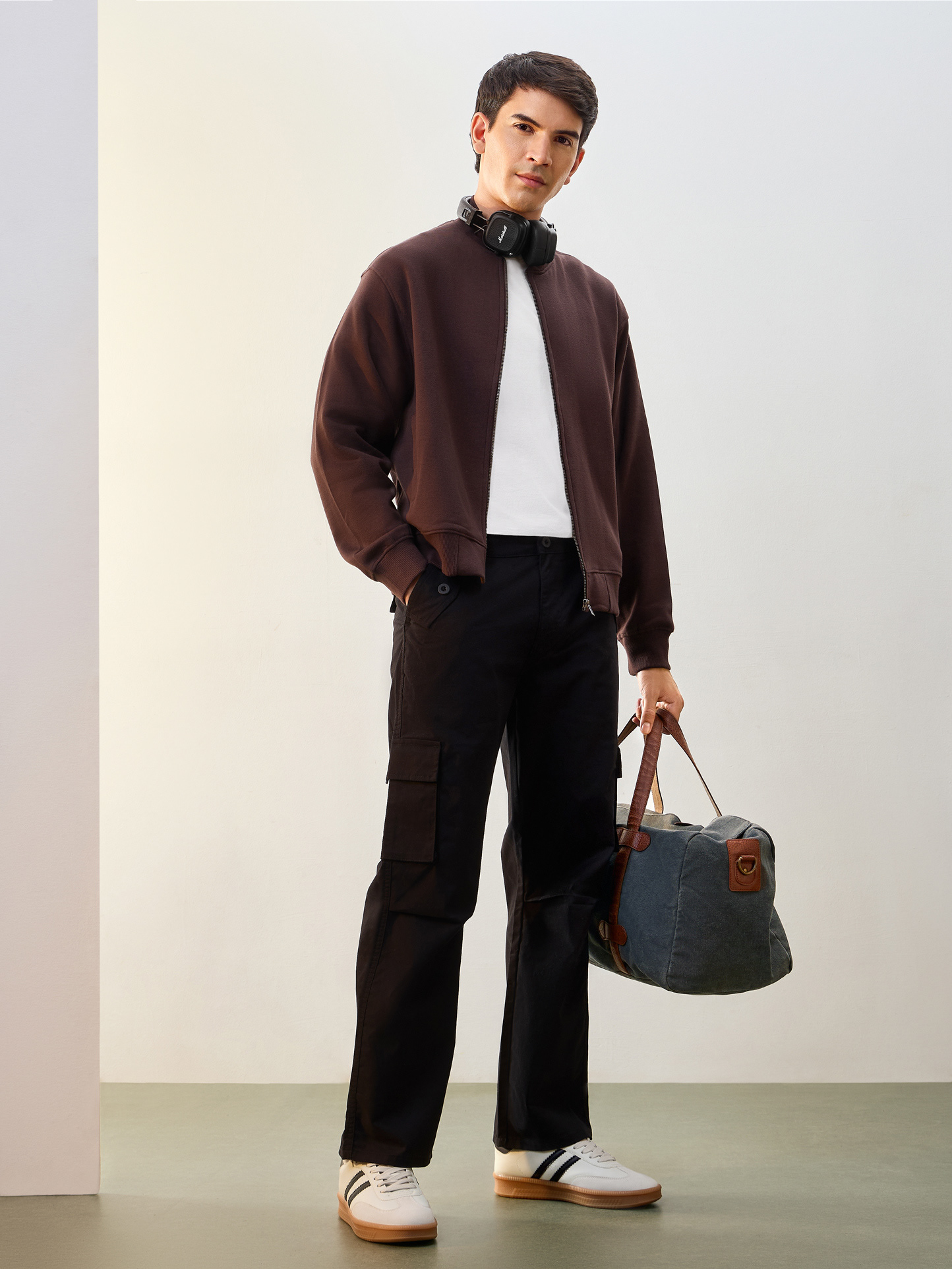 Nobero Men’s Travel Collection: A professional fashion campaign shoot replicating a luxury airport lounge. High-quality e-commerce imagery focusing on the "airport look" trend and functional travel apparel.